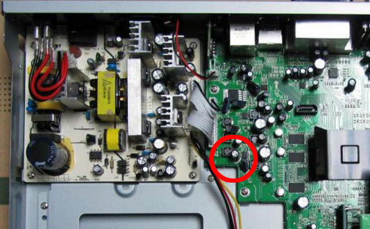 Op de Vu Duo zitten meerdere condensators, waaronder ook een condensator met de waarde “16V 220uF”. Deze is te vinden net naast de voeding, zie de foto hieronder. Deze condensator is vaak het probleem van hangende, niet doorstartende Vu Duo’s.